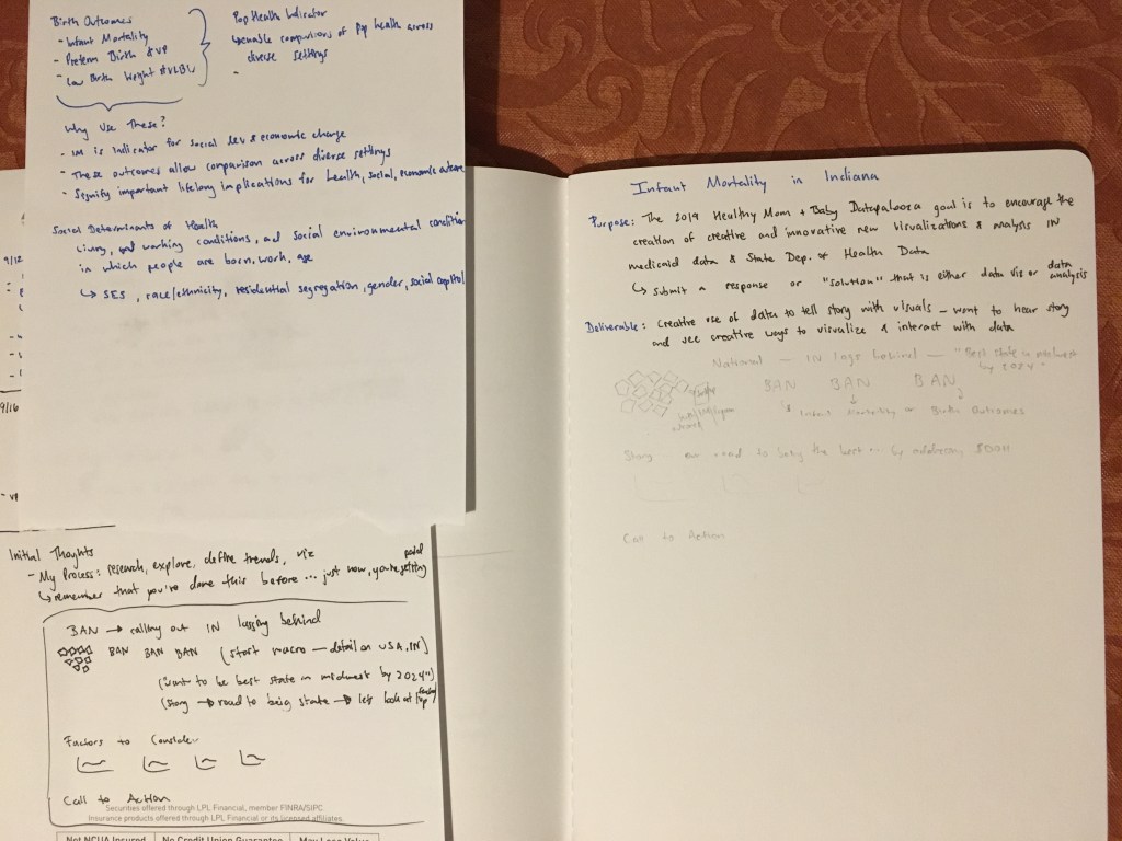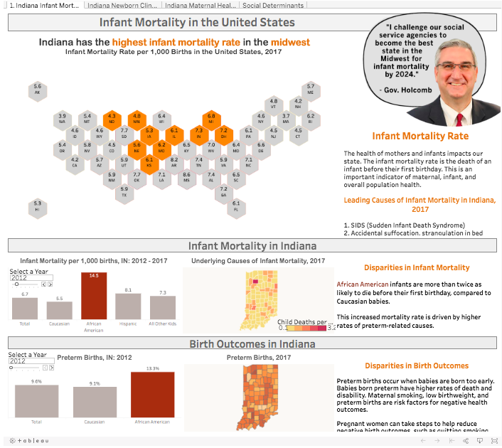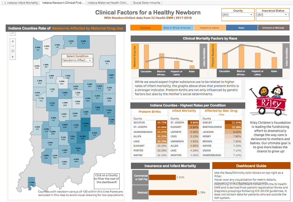 Together with my partner, Aubrey Xiong, we focused on data storytelling to visualize infant mortality in Indiana. First, we looked at the macro view of how Indiana compares to rest of the nation and explored health trends on a state and county level. Next, we approached a granular view of data by exploring clinical data from IU Health to understand clinical factors affecting mothers and infants. Finally, we focused on social determinants of health as an additional layer of insight with a focus on policies that can serve as solutions to improve infant and maternal health in Indiana. This was an iterative process throughout the data discovery and additional details were added after receiving feedback from judges of the competition and doctors at Riley Children’s Hospital.