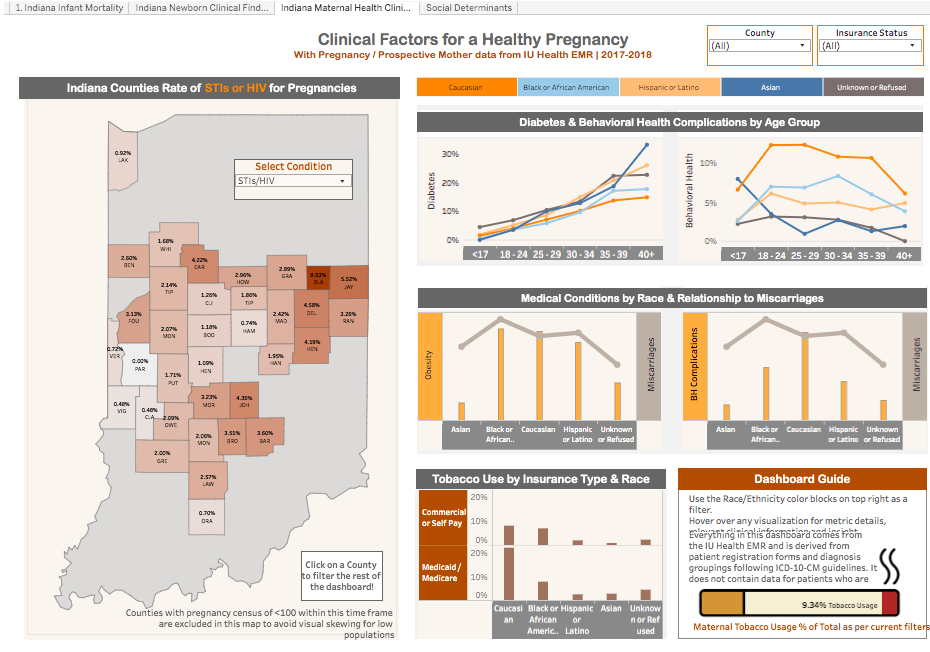 Next, Aubrey focused on data exploration within the electronic medical records of IU Health. She was gracious enough to walk me through this process – super helpful since it was my first few weeks at IUH. Relevant data from the medical records at IU Health was explored, providing a granular view and a deeper look at the trends. IU Health is the largest healthcare system in Indiana, which provided a bit of data to review and elaborate upon. Since we had no preconceptions of what medical relationships would be present – or what this would look across race/ethnicity, insurance, and location – we played around with this data prior to any visualization development. We created many flat tables and simple visualizations to explore clinical risks. We did this by picking specific categories for the risks as medical conditions tend to stem from sources both biological and environmental (i.e. diabetes, obesity, smoking, substance use, malnutrition). We explored this data, settled on a few data points, and began to design the user interface of the dashboard. User interface optimization is heavily dependent on the amount of data being presented, the intent of the message, and the target audience. We chose a simpler interactive style for the opening and concluding dashboard tabs for maximum visual stimulation and to drive our themes of social determinants and disparities by race/ethnicity. The middle two dashboard tabs is designed for our audience to dig into the data and encourages individuals to explore those differences across race/ethnicity, geography, and insurance.