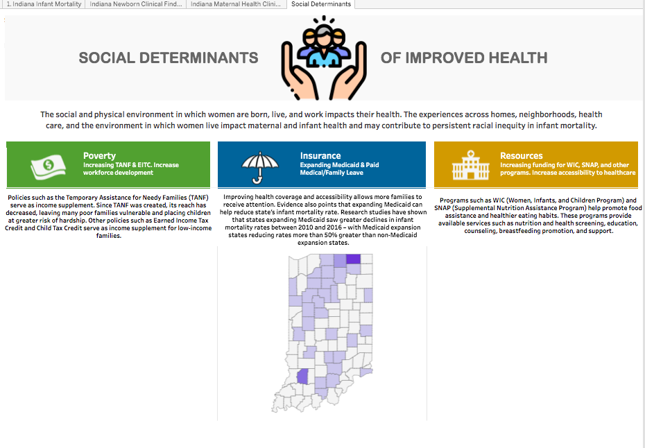 Indiana HIMSS in coordination with FSSA, ISDH, MPH, Regenstrief Institute, and KSM Consulting conducted a data visualization and analytics challenge. This competition focused on visualizing infant mortality in Indiana to ultimately improve health outcomes for Indiana’s mothers and infants.