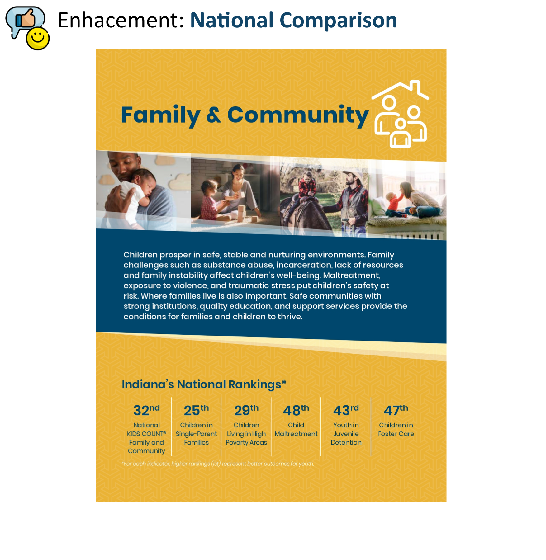 The 2019 Indiana KIDS COUNT® Data Book was the 25th anniversary and the challenge was to create an enriched product. This included identifying and prioritizing the product enhancements, aligning the product with the national KIDS COUNT® Data Book, and receiving feedback from stakeholders prior to publication.